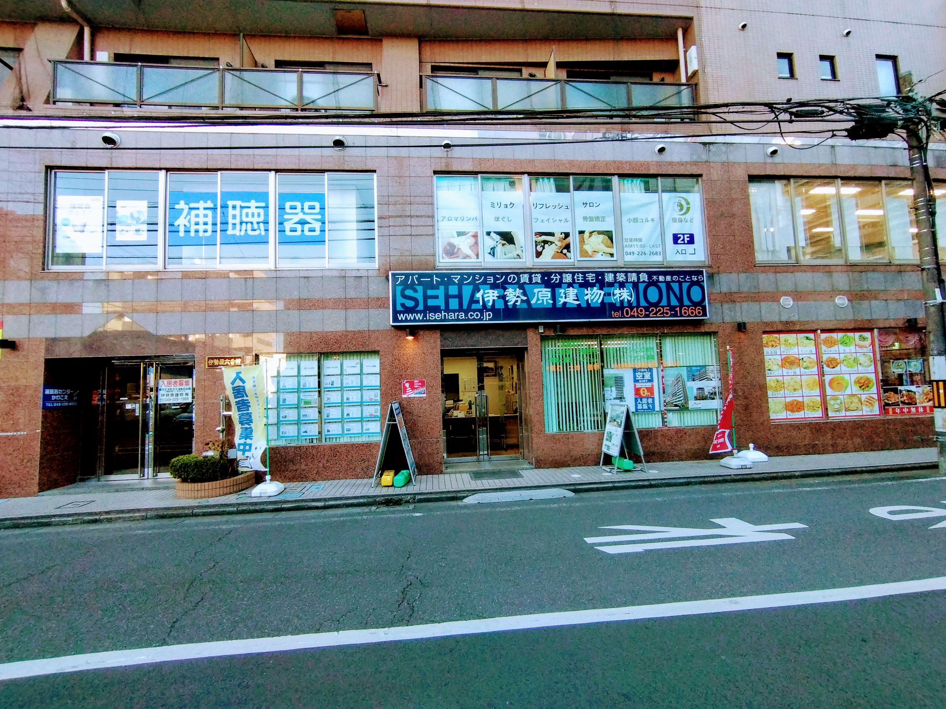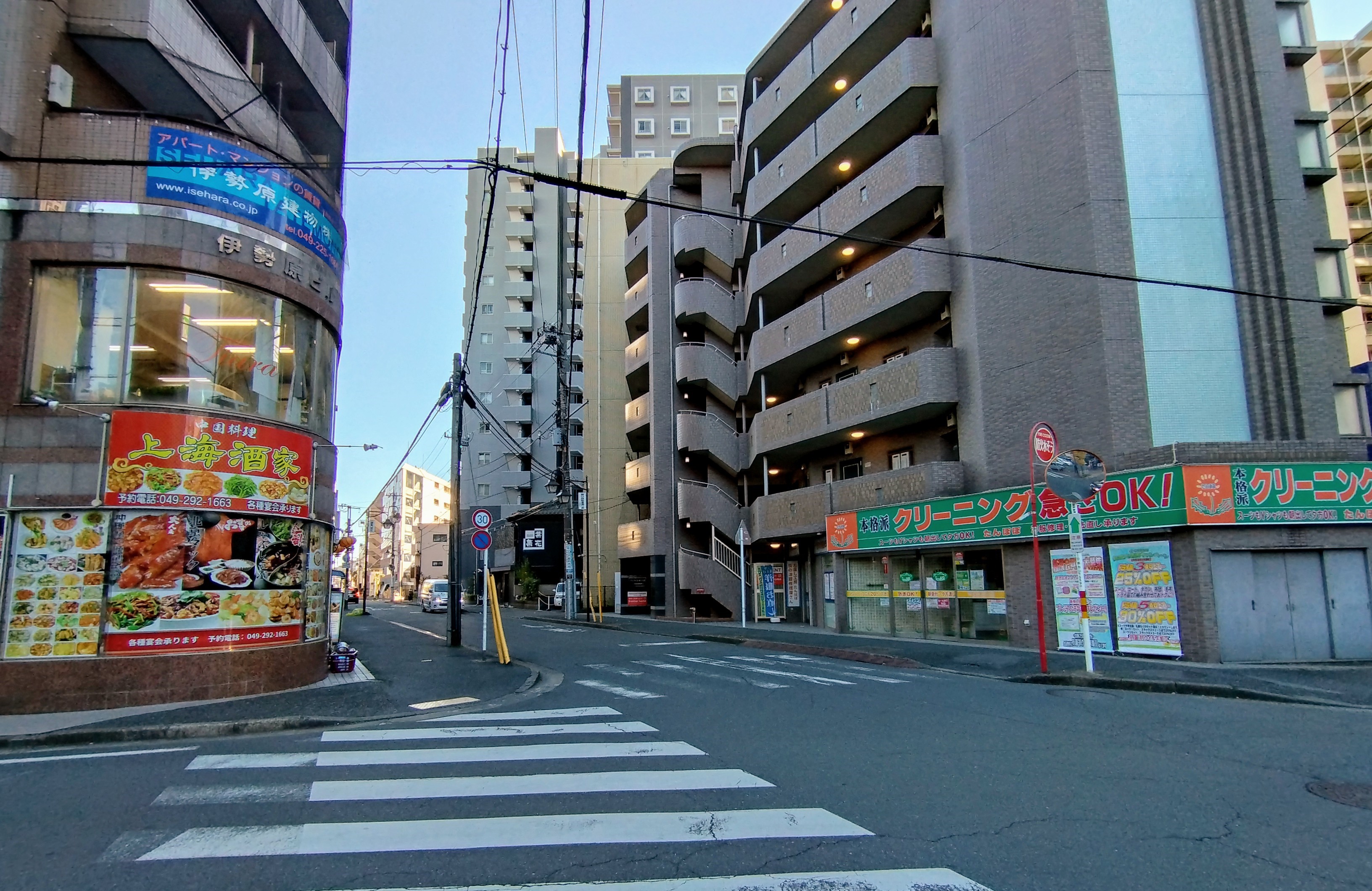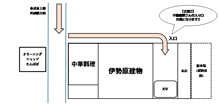 東武東上線川越駅方面から来られますと、右側にクリーニングショップ、道路を挟んで左側に中華料理屋があります。伊勢原六番館は、その中華料理屋があるビルとなります。中華料理屋の手前の道を入ります。